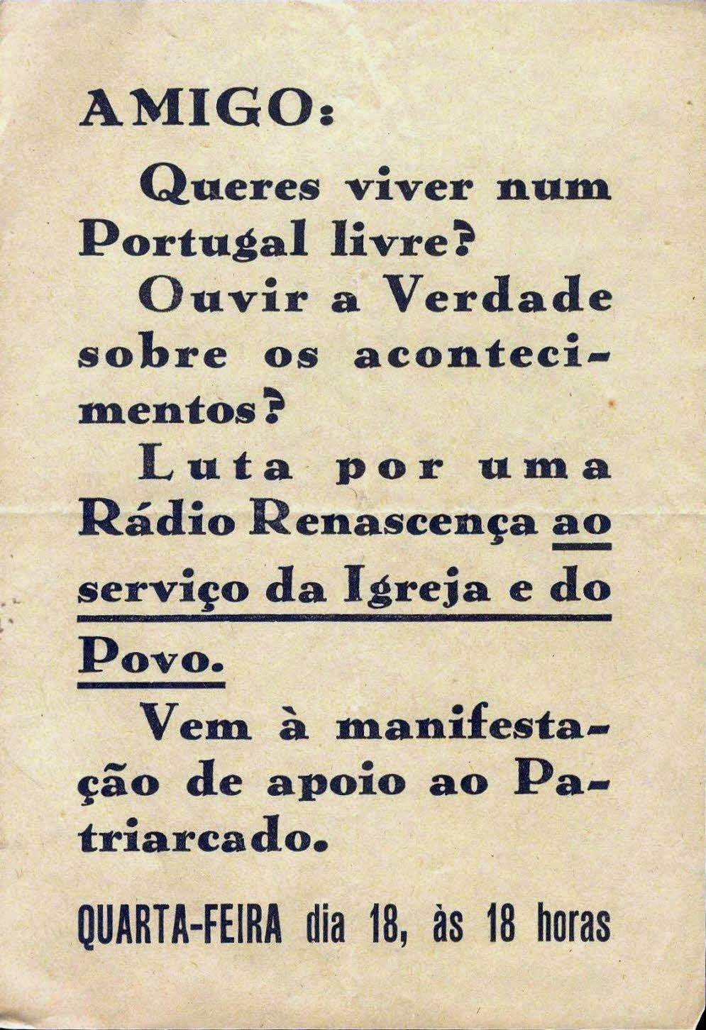 representativos de vários sectores – jornalistas, revisores de imprensa, tipógrafos e telecomunicações – convocaram uma manifestação a ter lugar junto do Patriarcado. E teria sido apenas mais um evento, entre muitos semelhantes que aconteciam quotidianamente, não se tivesse dado o caso de ter havido uma convocatória para uma contramanifestação, feita por muitos padres, a pedido do conselho de gerência da RR (texto na imagem, aqui ao lado).