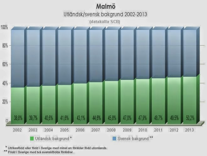 E é apenas a segunda de muitas cidades europeias cuja demografia será radicalmente alterada, talvez até irreversivelmente. O gráfico em baixo mostra a evolução, ou melhor, a involução da estrutura populacional de Malmö entre 2002 e 2013: