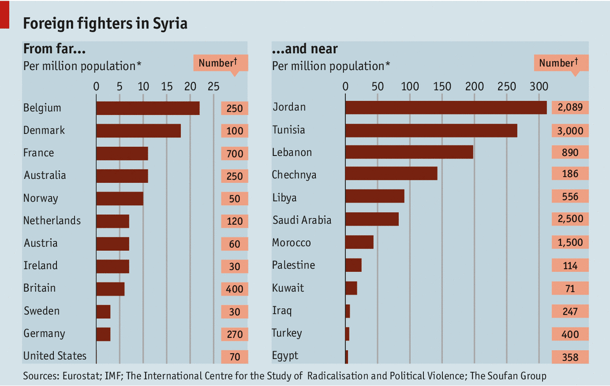 A capacidade que o ISIS tem demonstrado de recrutar combatentes na Europa Ocidental justificou um artigo na última edição da Economist, onde se publica um mapa que dá uma ideia precisa, quantificada, do que está a acontecer: