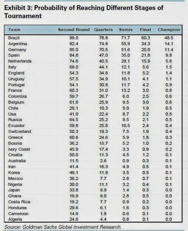 Os cálculos dos analistas do Goldman apontam para que Portugal alcance um segundo lugar sofrido na fase de grupos, que passe a Rússia nos oitavos-de-final, mas vamos ser derrotados pela Argentina nos quartos (temos inclusive menos de 1% de hipóteses de sermos campeões mundiais) As previsões do Goldman Sachs foram geradas a partir de variáveis que incluem todos os resultados de jogos competitivos das selecções desde 1960, rankings construídos a partir dos resultados das equipas, média de golos nos últimos dez jogos, e resultados atingidos em anteriores Mundiais. De acordo com este estudo os favoritos a alcançarem o triunfo são o Brasil (probabilidade de 48,5%), Argentina e Alemanha (com 14,1% e 11,4%). Os analistas do Goldman referem ainda que este "modelo previu correctamente 13 das 16 equipas que avançaram para a fase a eliminar, cinco das oito equipas que atingiram os quartos e três das quatro que chegaram às meias-finais no Mundial 2010". VM
