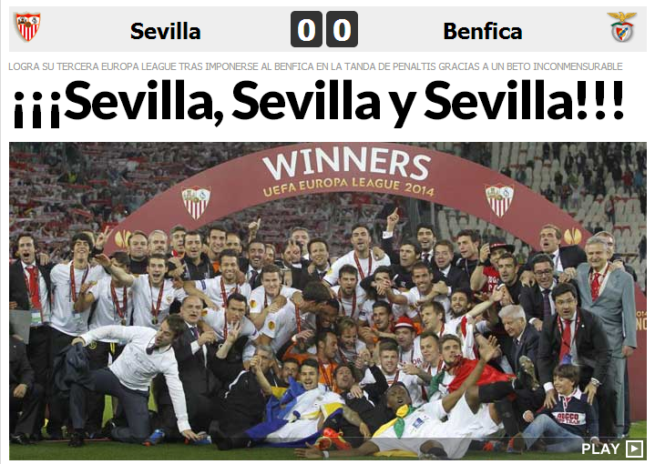 Sevilha - A sorte esteve do lado do emblema espanhol (pelo que fez durante os 120 minutos não merecia ter conquistado esta final). Beto foi o herói e um dos principais responsáveis pelo triunfo nesta Liga Europa (quem acompanha os posts do VM para o Mundial não fica surpreendido). Mas apesar dos espanhóis possuírem alguns elementos acima da média, são mais as limitações que as virtudes, principalmente a nível defensivo (Carriço, Fazio e M’Bia são jogadores fraquíssimos na construção e que cedem facilmente quando são pressionados, algo que não foi devidamente explorado pelo Benfica). Até Moreno, que é um excelente lateral esquerdo, tremeu bastante. Do meio campo para a frente, há mais qualidade. Rakitic é um jogador à parte e Vitolo foi um dos mais activos, embora tenha pecado no capítulo da decisão. Bacca fez um jogo fraco, demonstrando algumas lacunas técnicas e não conseguindo fazer a diferença na finalização.