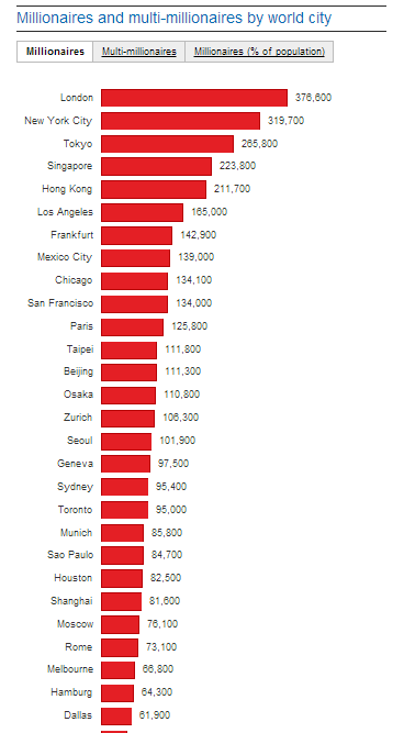 The city’s 395,600 dollar millionaires put it top of the list compiled by Johannesburg-based wealth consultancy New World Wealth. A report last year by rival WealthInsight ranked London third behind Toyko and New York.